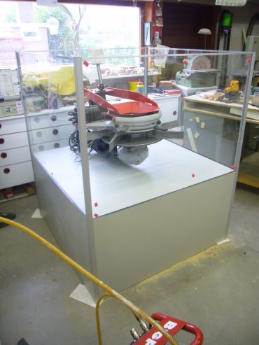 Zuilen,balie en plafond van MDF in kleur gespoten.